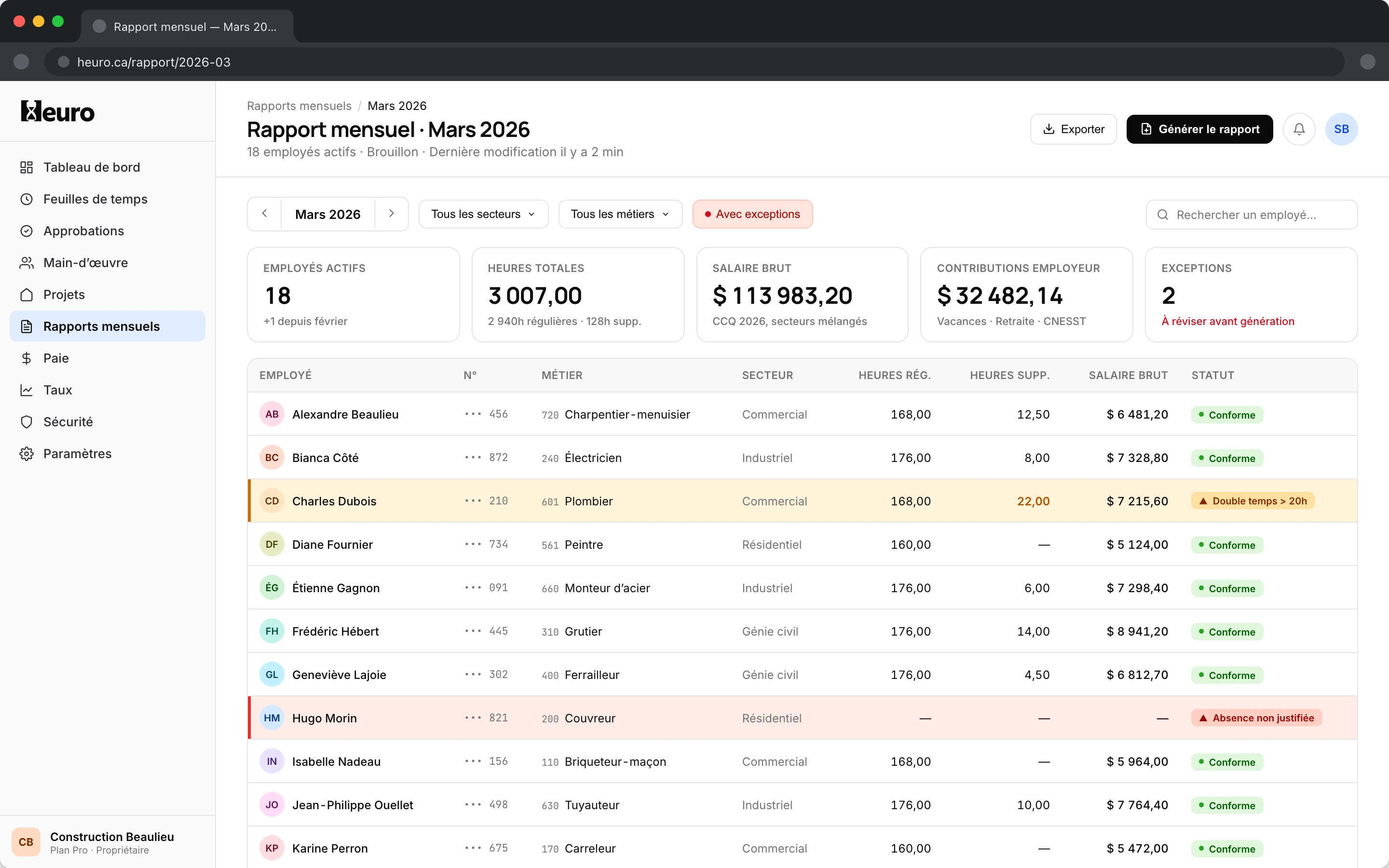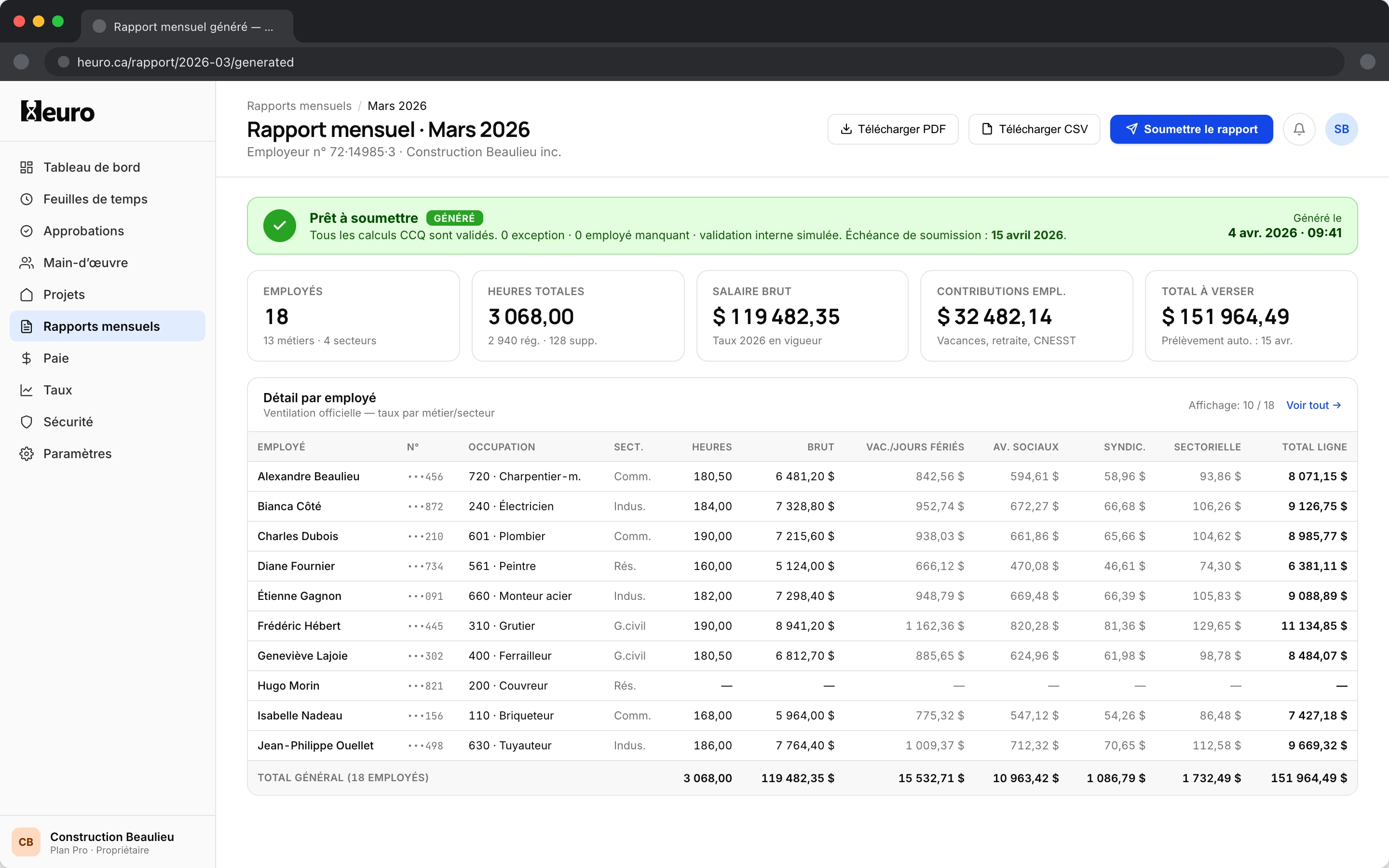 Vos employés remplissent leurs heures. Heuro génère automatiquement les rapports requis, prêts à être soumis en ligne.